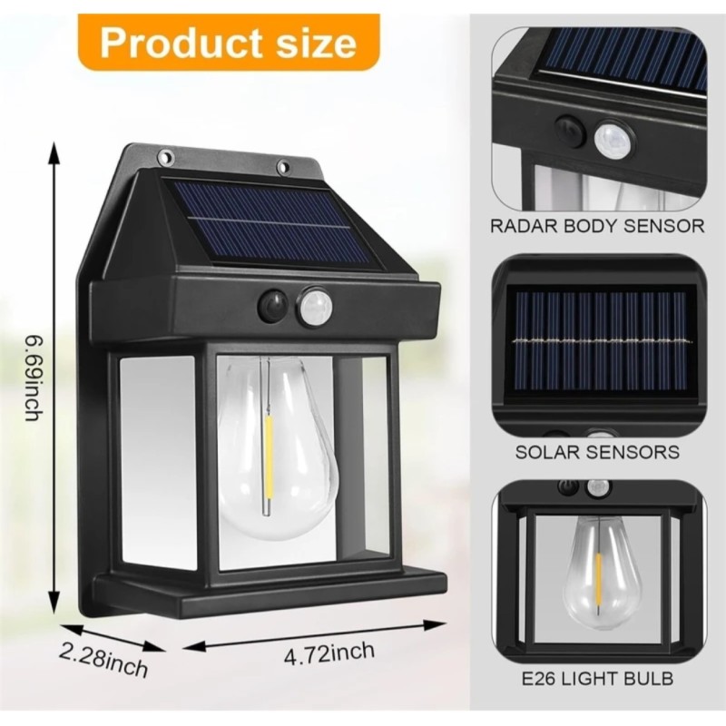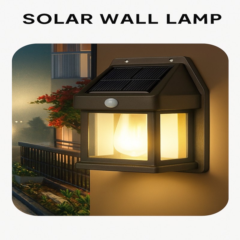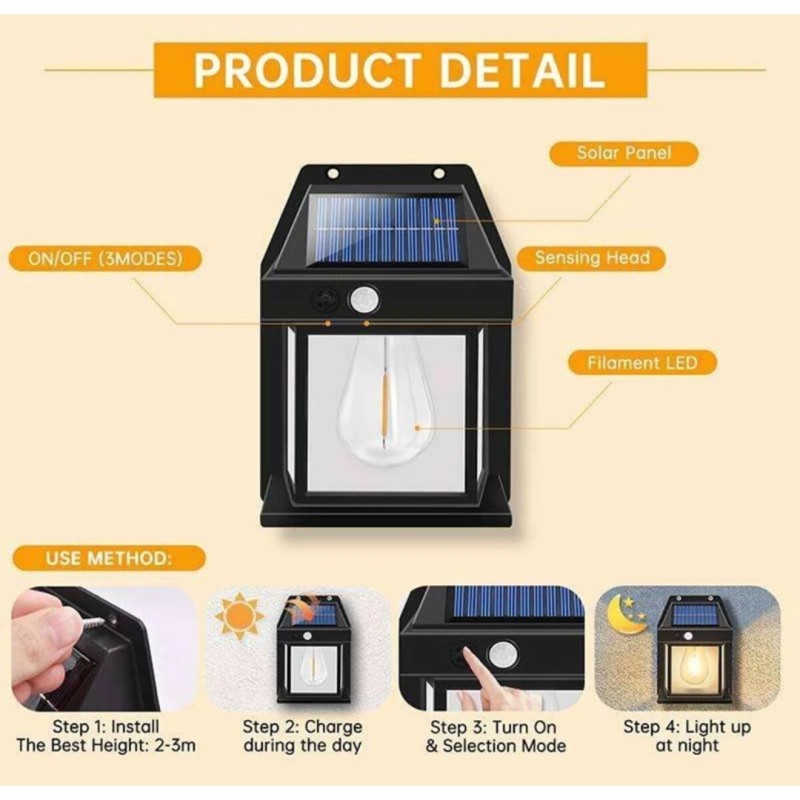 This solar-powered wall lamp automatically turns on in the dark and turns off in the daylight. Perfect for outdoor use, waterproof design, and easy to install.